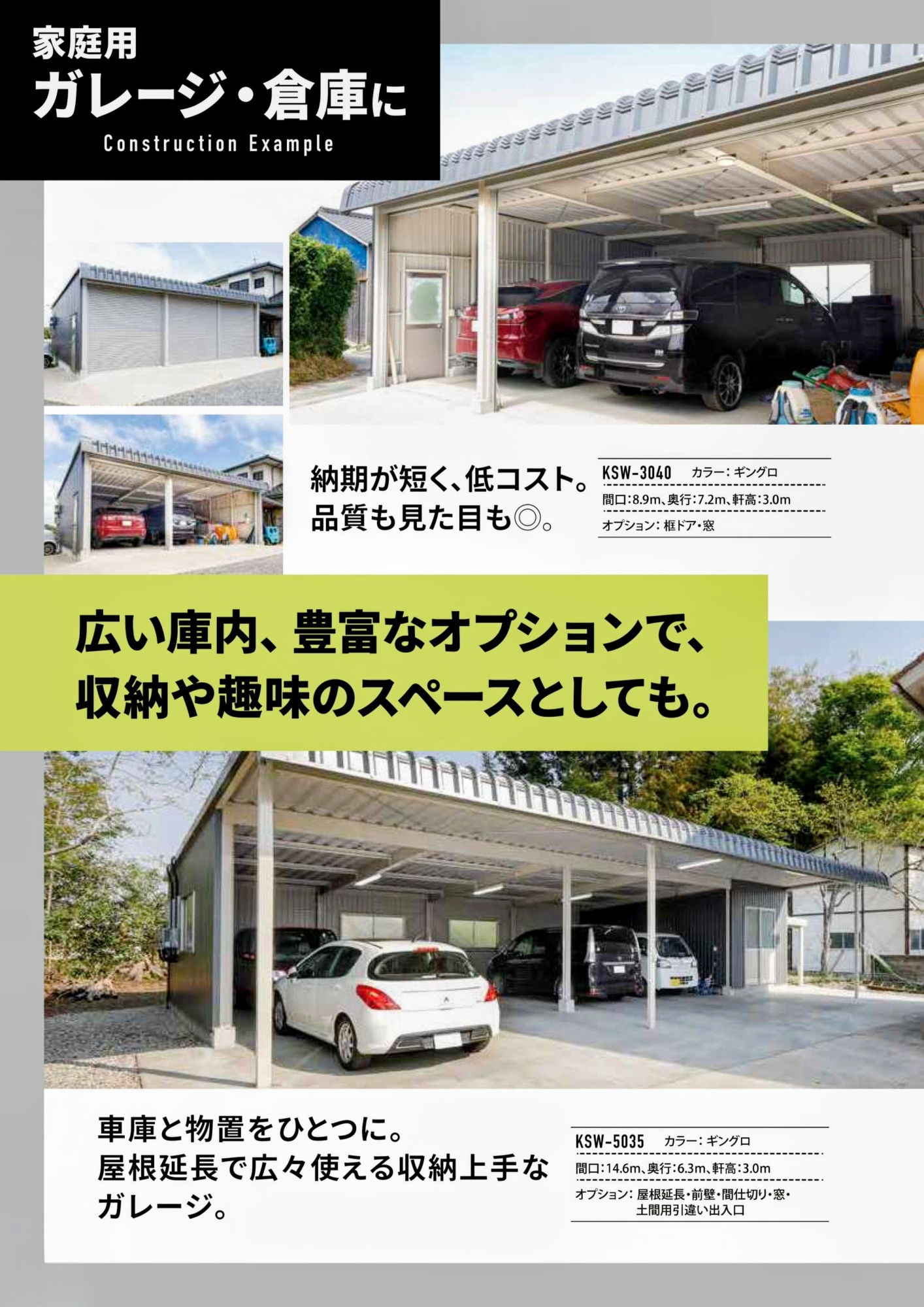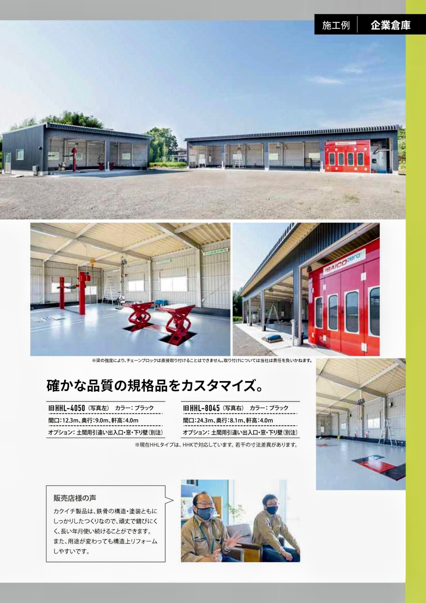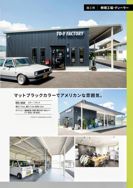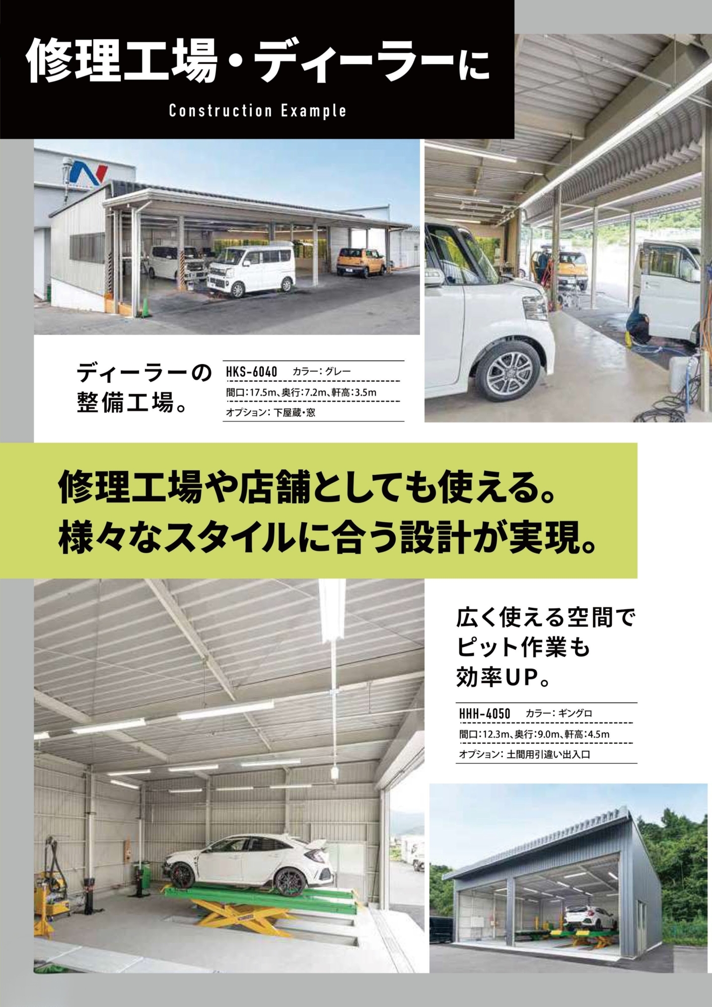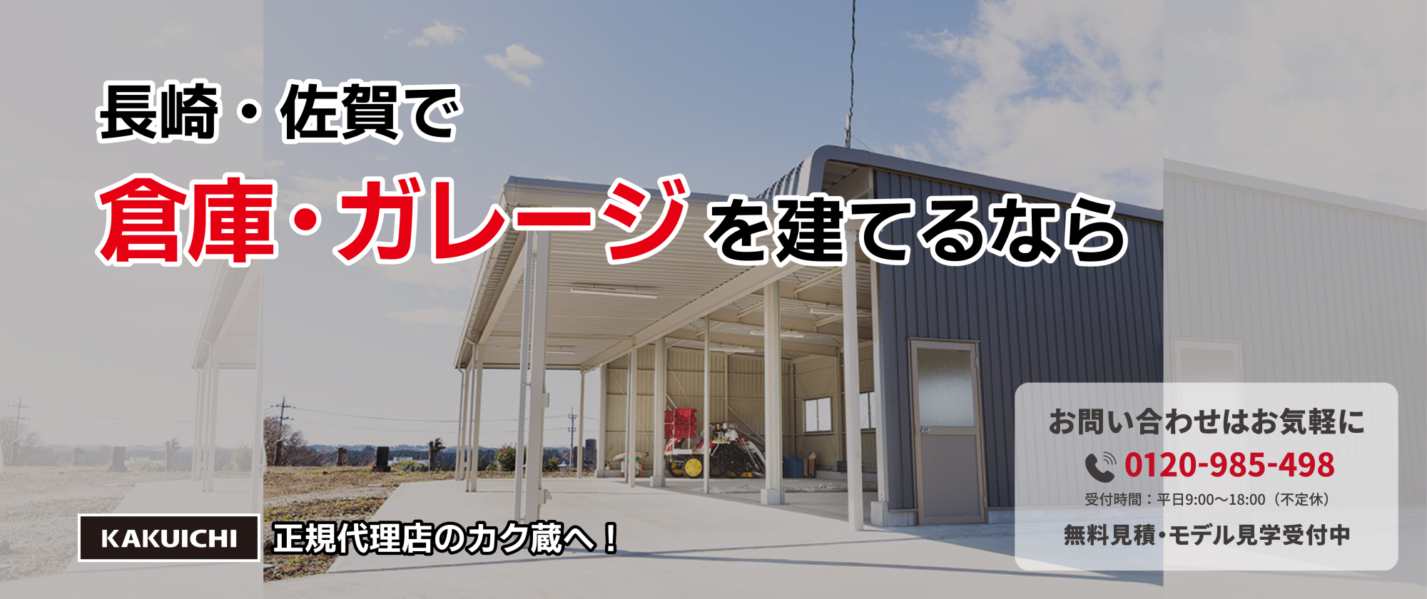農家・農業用倉庫に 収納庫・作業場・農機格納庫に 間仕切りで分ける収納・短工期・ライスセンターに 趣味・バイク・隠れ家に・店舗にも HHD ミニタイプ 修理・整備工場 ディーラーに 修理工場 店舗 ピット作業 企業倉庫に 工場+事務所 大収納倉庫 家庭用ガレージ・倉庫に 収納や趣味に 中2階を活用 営業エリア 長崎県(長崎市 佐世保市 島原市 諫早市 大村市 平戸市 松浦市 西海市 雲仙市 南島原市 長与町 時津町 東彼杵町 川棚町 波佐見町 佐々町)佐賀県(佐賀市、唐津市、多久市、伊万里市、鹿島市、嬉野市、武雄市、小城市、太良町、白石町) 展示場で実物を見よう。 ↑展示場予約フォーム 製品紹介サイトへ 施工事例サイトへ 事業用施設例 展示場へ行こう 展示場見学予約 会 社 概 要