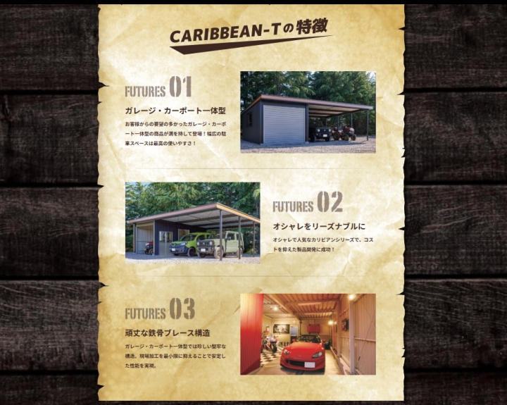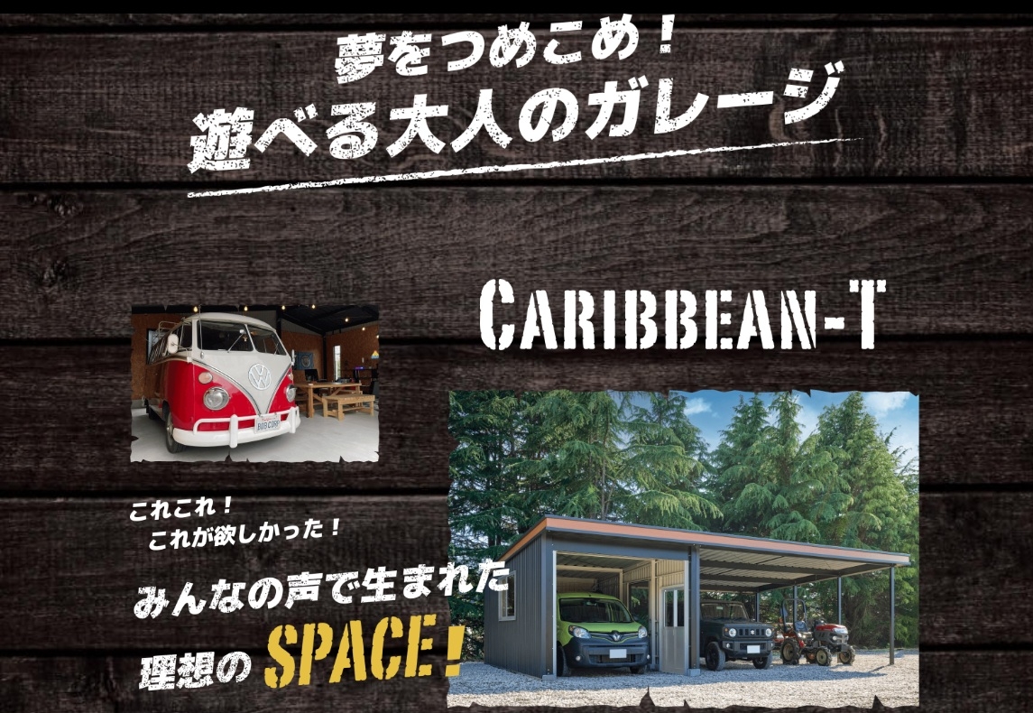 HOME 製品紹介 【夢をつめこめ】CARIBBEAN-T 【夢をつめこめ】CARIBBEAN-Tシリーズ ガレージ・カーポート一体型遊べる大人のガレージ 理想のスペース みんなの声で生まれた理想のSPACE! おれこれ!これがほしかった カリビアンの特長 ガレージ・カーポート一体型 【SPEC】CARIBBEAN-T ガレージ・カーポート一体型 KCT 1台~5台 KCT ER1 1台~4台 カーポート一体型 KCT ER1 1台~3台 カーポート一体型 製品紹介TOP画面へ 製品紹介TOP 施工例をご覧ください 施工事例 ラインナップへ 【ガレージ・倉庫】 広スペースハウス 【ガレージ・倉庫】広スペースハウス(L) 【切妻おしゃれガレージ】 H H D 【趣味空間&ガレージ】MINI-HHD 【鉄骨カーポート】 キャノポート 高級カーポート】 B - CANO 【自由にカスタム】 A-SITE 【HOME】