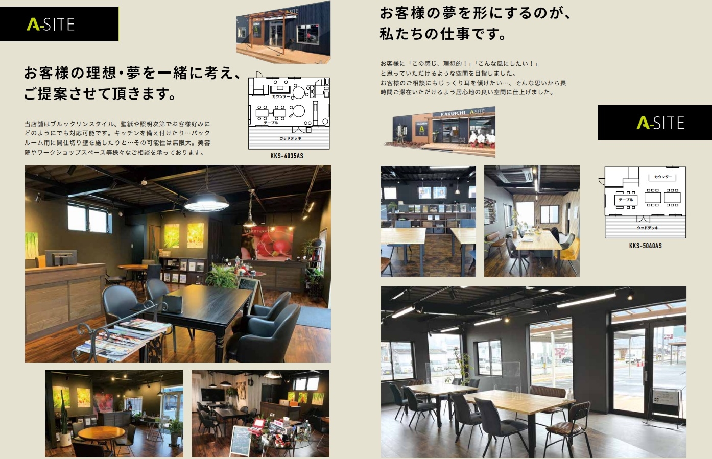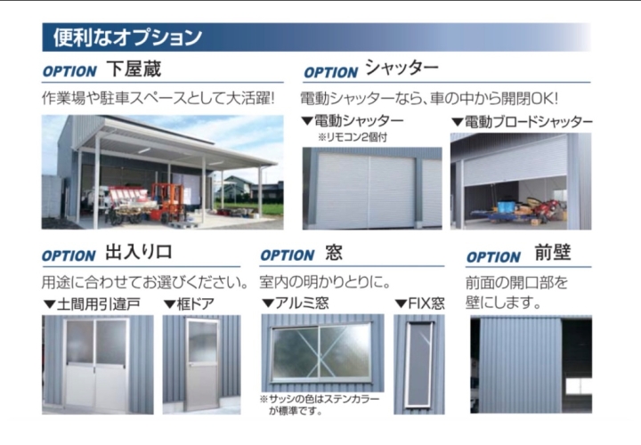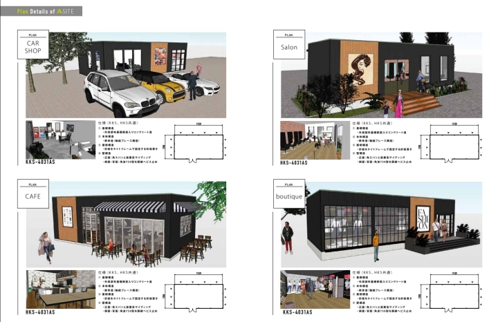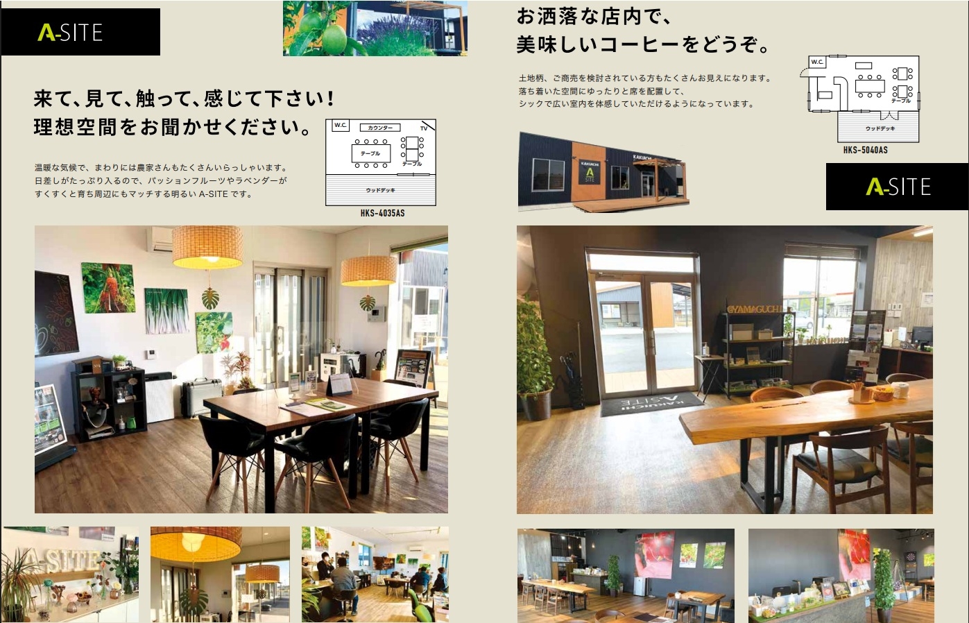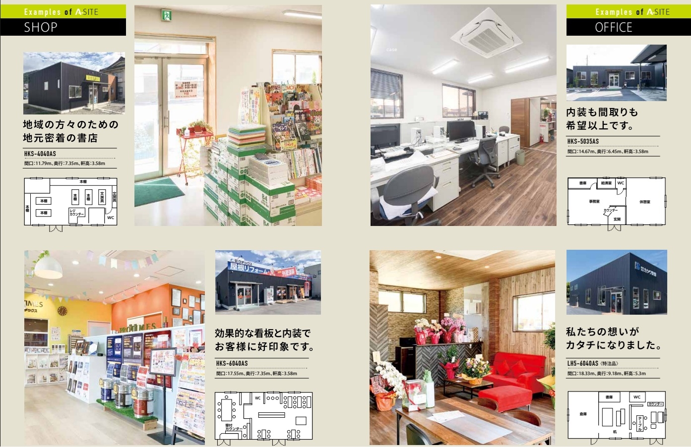 HOME 製品紹介 【自由にカスタム】A-SITE 【自由にカスタム】A-SITE カフェ、シェアオフィス、直売所、店舗、内装はお好みでカスタマイズ! カフェ、シェアオフィス、直売所、店舗 事務所 内装はお好みでカスタマイズ! 【OPTION】A-SITEサイト オプションをお選び下さい HOME 施工事例 事業用施設例 製品紹介へ 【ガレージ・倉庫】 広スペースハウス 【ガレージ・倉庫】広スペースハウス(L) 【切妻おしゃれガレージ】 H H D 【趣味空間&ガレージ】MINI-HHD 【鉄骨カーポート】 キャノポート 高級カーポート】 B - CANO 【夢をつめこめ】C A R I B B E A N - T